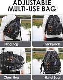 - â¨ăFree AdjustmentăTOMSHOO tackle bag with a variety of ways to wear, you can transform it from a sling pack to a traditional over the shoulder backpack with a waist clip. The straps can be 1 strap or unzip and you get shoulder straps.