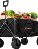 - 【4-inch Wide Universal Wheels】: TOMSHOO beach wagon with 7"x 4" wide 360° rotation front wheels are an outstanding feature of this garden cart, it can be easily used in lawn, forest, beach. The wheels have locks to keep it from rolling away.
